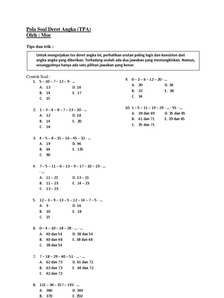 Untuk contoh soal tpa deret angka dan huruf ini tugas sobat hanyalah melengkapi deretan . Contoh soal test value bumn telkom · general cognitive ability test, yang meliputi: New zeland #soal psikotes padanan kata 7.pasar a.sepatu b. Dalam contoh soal value bumn diatas, terdapat deret angka dimana bila anda . Cara menjawab soal psikotes deret angka.